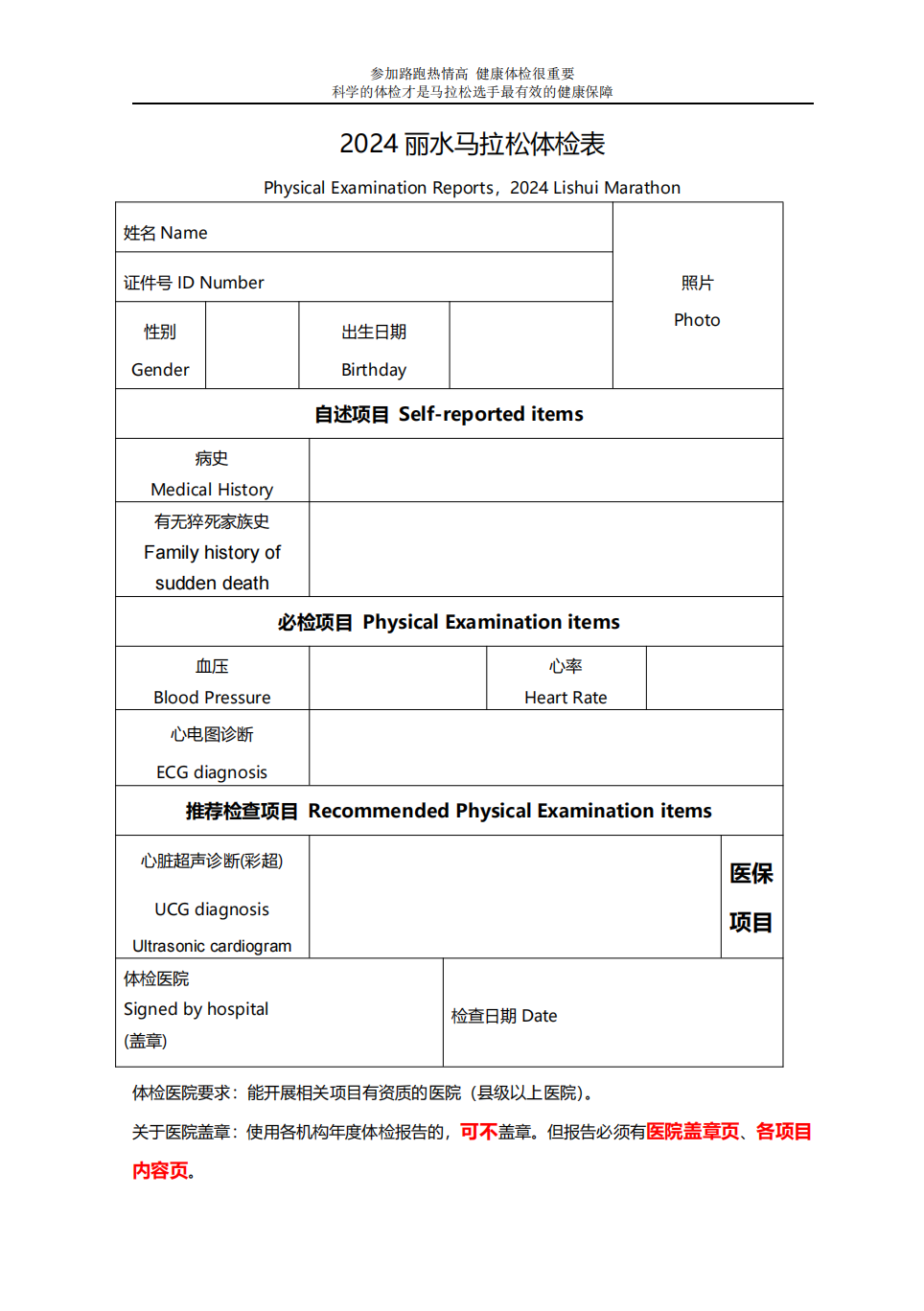 体检证明要求:2023年3月31日(含)后的体检内容,要求有自述病史、有无猝死家族史,提交具有资质医院的血压、心率和心电图检查结果。建议提交心脏超声诊断(彩超)检查结果。具体要求详见《2024丽水马拉松体检模板》,体检机构的报告和马拉松体检模板均可使用。体检报告不合格者将取消其参赛资格,退还报名费。