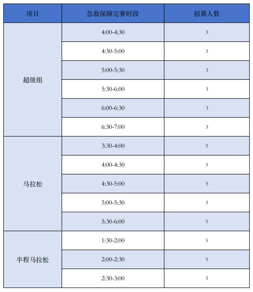 本次2024中广·未来城丽水马拉松计划招募急救跑者58名,其中超级组18名、马拉松25名、半程马拉松15名,具体分配如下: