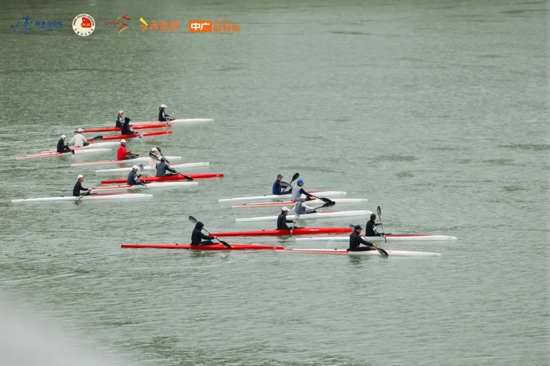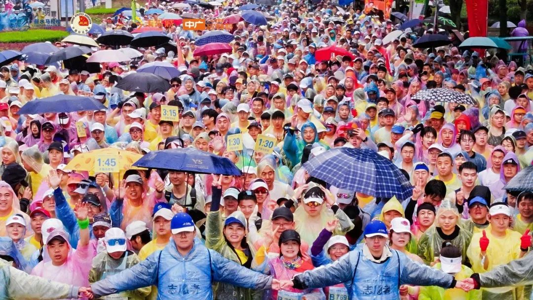 开赛前300名运动员轮滑刷街助力丽马。发令枪响瞬间,立鼓表演同步开启震撼演奏,跑者们如同潮水一般从起点涌出,开启42.195公里的山水征程。